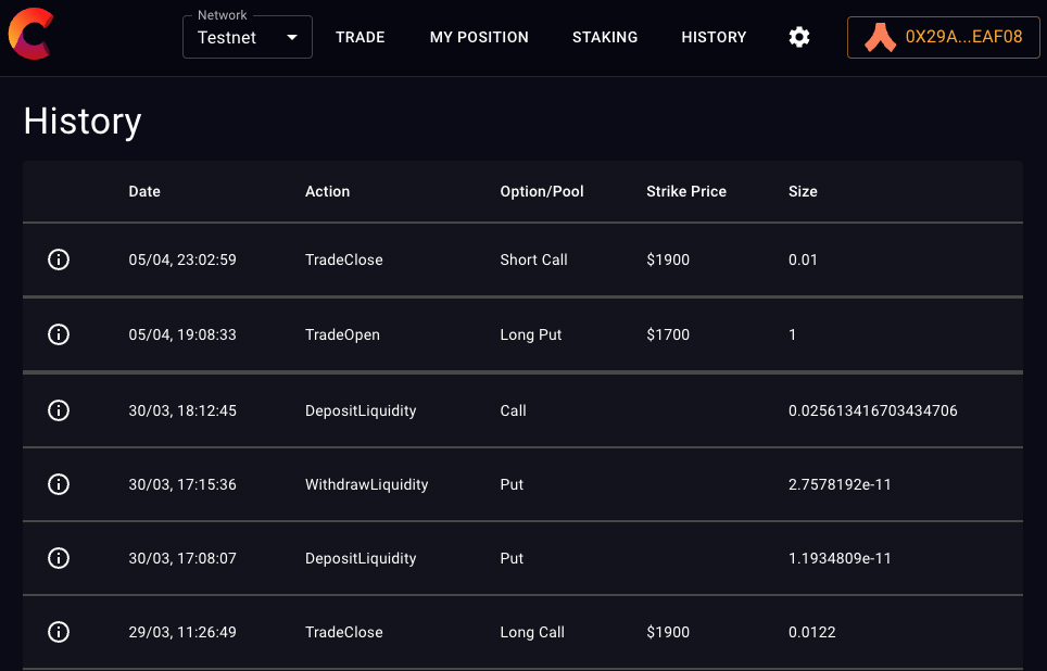 3. Browse overview of all transactions performed by your wallet address with Carmine Protocol. Please note that it takes up to 20 minutes for a transaction to appear in the history table.